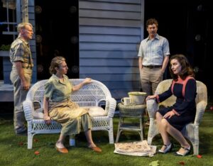 Sound designer Gareth Fry compounds the startle factor with creaks, thuds, and powerful music blackouts between scenes. The prelude by Radiohead’s “Just” is a jolt in itself. Fry is joined by video designer Luke Halls who provides, in particular, a random television montage that is set off to fracture the peace of the house and the introduction to James’ omnipresent mother.
